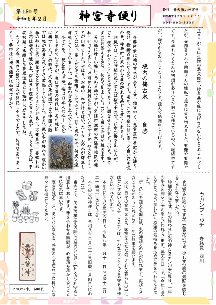 寺務所前に梅の古木があります。伯父曰く、元首里市長宅から譲り受け、樹齢百年になるそうです。毎年、この時期に甘い香りと白い花を咲かせ、寺務所に爽やかな春の訪れを感じさせてくれます。